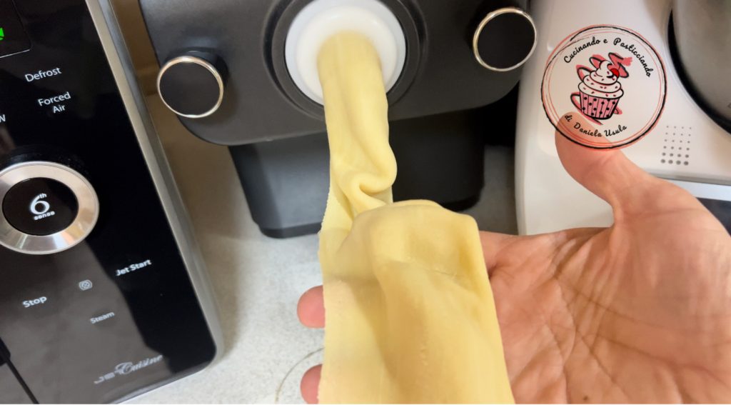 À part, préparer la pâte fraîche selon la recette. Moi, j’ai utilisé la machine à pâte qui pétrit et extrude directement. Mais vous pouvez la faire comme vous préférez.
