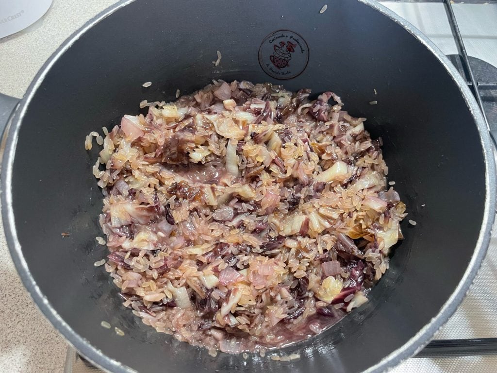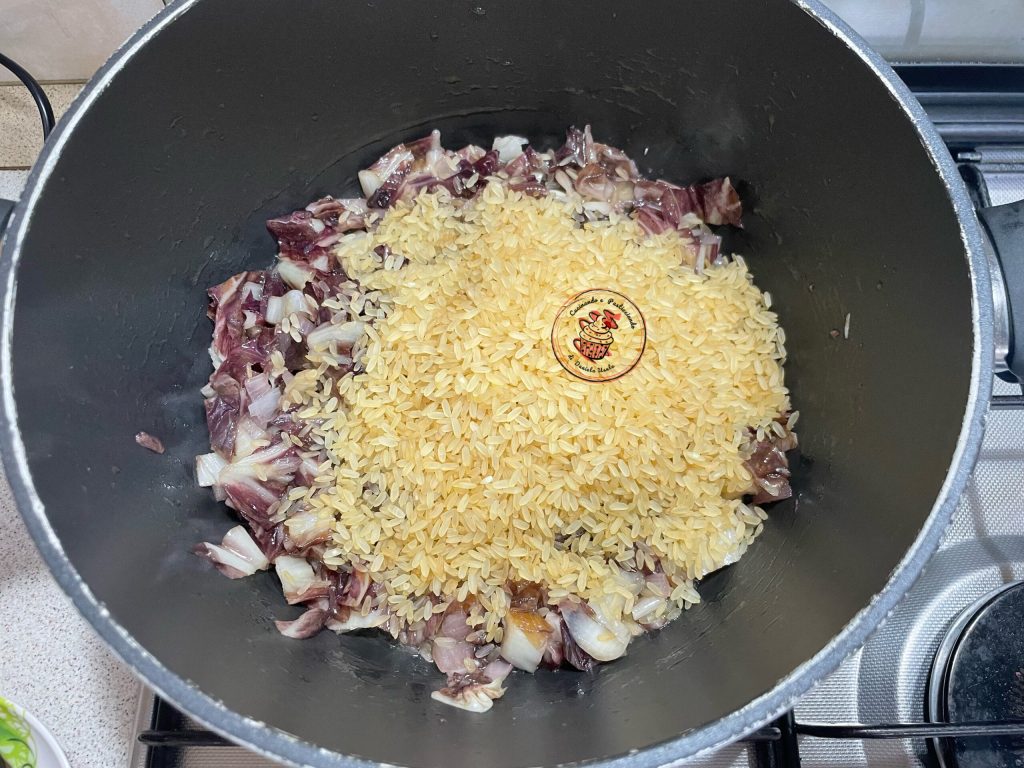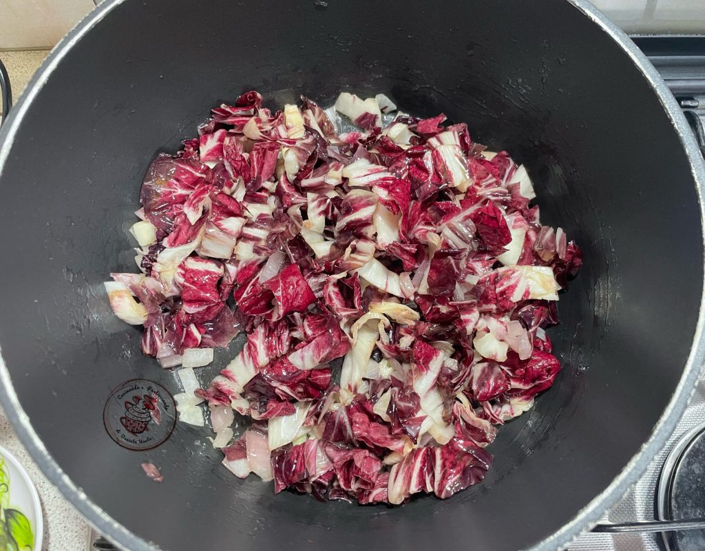 Lavez bien le radicchio, coupez-le en lanières et faites-le cuire 5 minutes avec l’ail et l’oignon hachés. Préparez le bouillon chaud à part.
