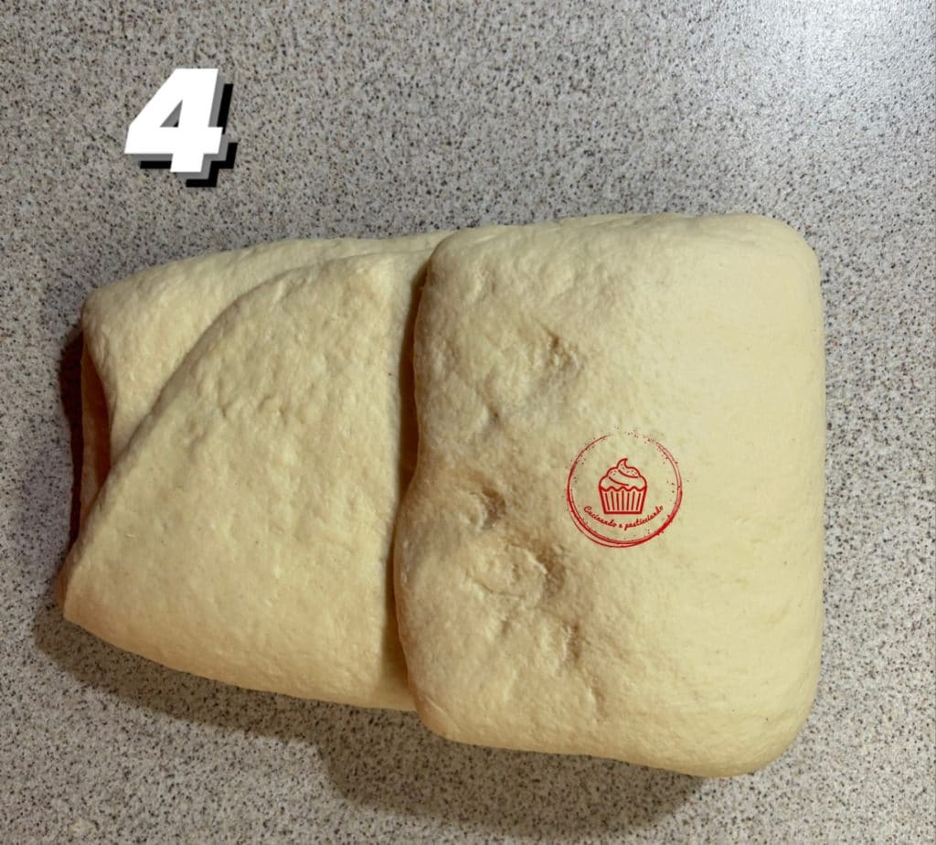 Ensuite, j’ai pétri à la main environ 5 minutes pour faire absorber le sel. Puis j’ai fait un tour de pliages en trois. Je les ai répétés trois fois à 15 minutes d’intervalle.