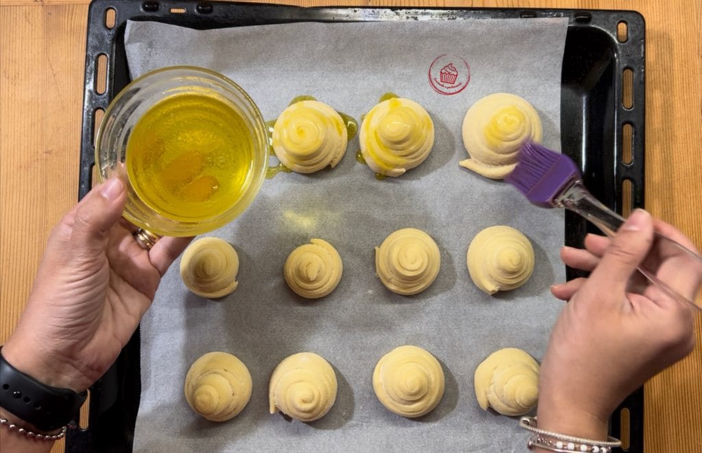 J’ai laissé lever sur la plaque jusqu’au doublement, puis j’ai badigeonné avec une saumure d’eau, d’huile et de sel, et j’ai enfourné à 200°C pendant environ 20 minutes.