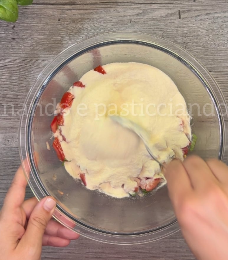Bien mélanger avec les mains en pressant bien les tomates pour en extraire tout le jus. Couvrir avec du film alimentaire et laisser reposer environ 2 ou 3 heures.