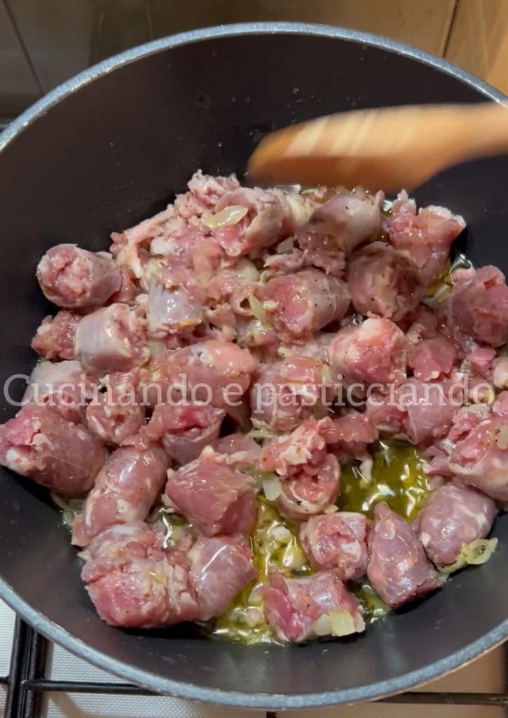 • Dans la casserole, faire revenir la saucisse coupée en morceaux (une partie) et émiettée (une autre partie) avec l’huile, les arômes et les épices.