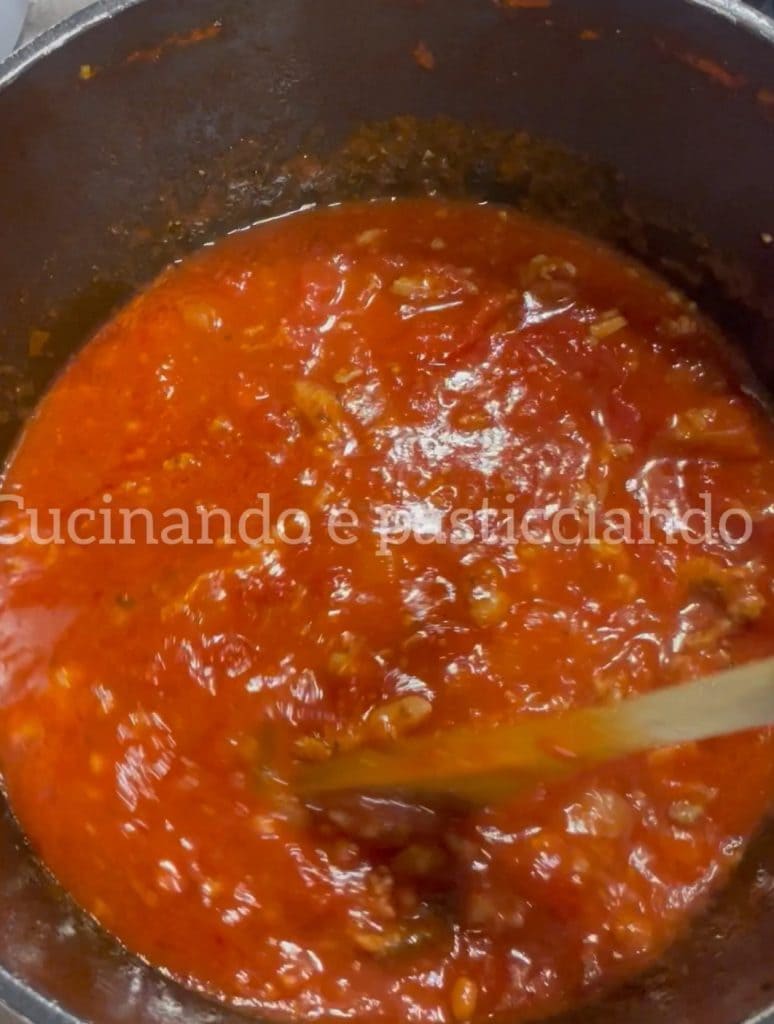 • Ajouter le bocal de tomates pelées mixées. Assaisonner avec du sel et cuire pendant environ 50 minutes, en remuant de temps en temps.