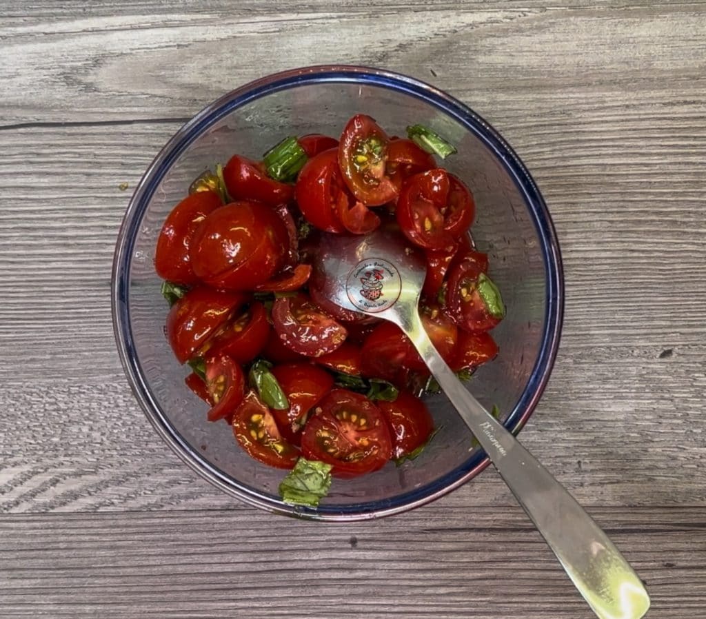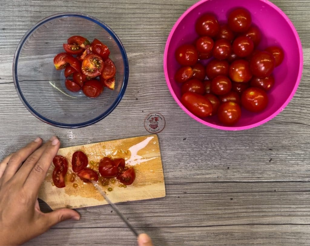 Pendant ce temps, préparez la garniture. Dans un bol, coupez les tomates cerises.