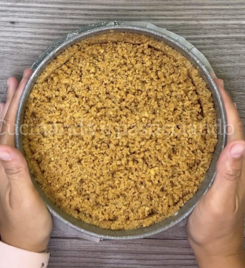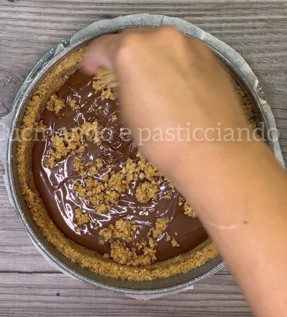 Reprendre la base, y verser la crème de noisette et recouvrir avec le reste de la pâte de biscuits en l’émiettant sur la surface.