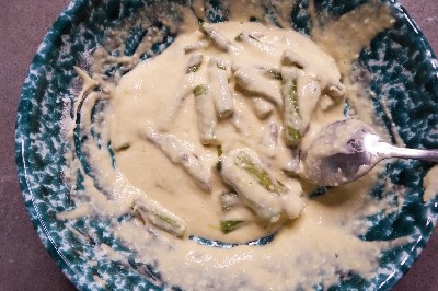 Mettez les asperges dans le bol de pâte et mélangez délicatement jusqu’à ce qu’elles soient complètement enrobées