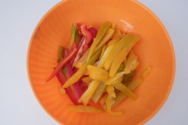 • Lavez et séchez bien les poivrons, coupez-les en deux, retirez la tige, les graines et les filaments blancs. Réduisez-les en lanières.
