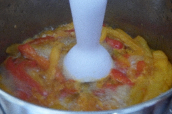 • Quand les poivrons sont ramollis, mixez-les avec un mixeur plongeant. Poursuivez la cuisson en remuant fréquemment jusqu’à ce que la confiture épaississe.