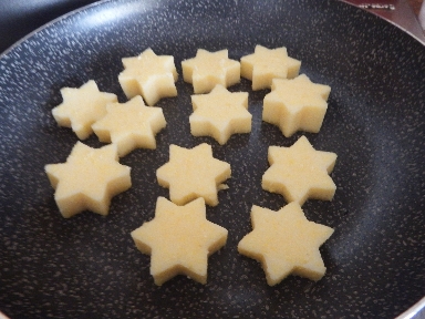 • Retirez la polenta précuite de l’emballage et coupez-la en tranches de 1 centimètre d’épaisseur. Découpez chaque tranche avec des emporte-pièces en forme d’étoile. Je vous recommande ceux-ci de Tescoma, ils sont vraiment uniques!