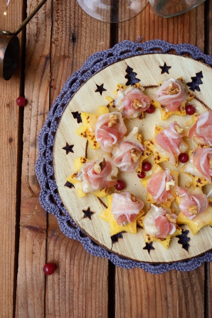 Étoiles de polenta prêtes en 5 minutes farcies avec du gorgonzola, du lard et des noix hachées, pour un apéritif des fêtes ultra rapide et super gourmand!