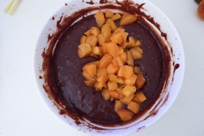 Coupe les abricots en morceaux, ajoute-les dans le mélange du gâteau et mélange soigneusement à l’aide d’une spatule
