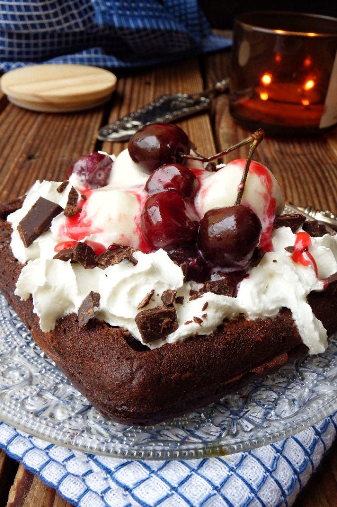 Après les gaufres salées qui vous ont tant plu, aujourd’hui je veux vous montrer une autre version à s’en lécher les babines, mais cette fois-ci sucrée : les gaufres Forêt Noire. Des gaufres au cacao, garnies de glace, chantilly, copeaux de chocolat et cerises. Un véritable délice pour vos brunchs ou pour des petits déjeuners spéciaux.