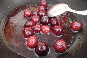 Pendant ce temps, dans la poêle, mets les cerises dénoyautées avec le beurre, le sucre et le jus de citron. Fais cuire quelques instants, ajoute ensuite la maïzena dissoute dans un peu d’eau et continue la cuisson jusqu’à obtenir une base crémeuse. Éteins le feu et laisse tiédir