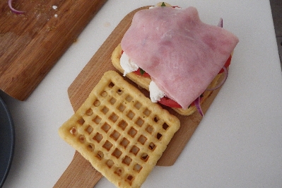 • Enfin, mettez les feuilles de laitue iceberg, couvrez avec l’autre gaufre comme un véritable sandwich et bon appétit ! Vous pouvez trouver la vidéorecette ICI sur mon profil Tik Tok @isaporidicasa
