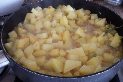 Épluchez les pommes de terre et coupez-les en petits dés. Dans une grande poêle aux bords hauts, mettez un filet d’huile et faites revenir le hachis de carotte, céleri et oignon. Ajoutez les pommes de terre avec le brin de romarin et faites revenir en mélangeant fréquemment. Versez ensuite le bouillon chaud et cuisez jusqu’à ce que les pommes de terre soient cuites al dente. En fin de cuisson, éteignez le feu, retirez le brin de romarin et ajustez avec du sel et du poivre.
