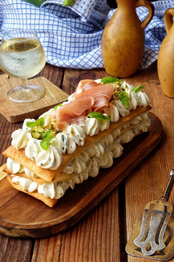 Elle se compose de trois couches de pâte feuilletée, garnies d’une mousse délicate au basilic et pistaches. J’ai choisi des saveurs qui peuvent plaire à tout le monde, mais vous pouvez laisser libre cours à votre imagination en enrichissant la sauce avec ce qui vous plaît, comme par exemple des câpres et des olives.