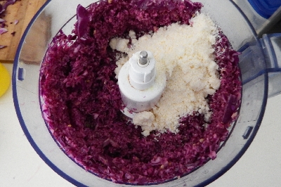 • Mettez dans le robot de cuisine le chou rouge coupé en lamelles, les pignons, pistaches, demi-gousse d’ail sans germe, les feuilles de thym et le jus de citron. Actionnez le mixeur jusqu’à obtenir un mélange granuleux