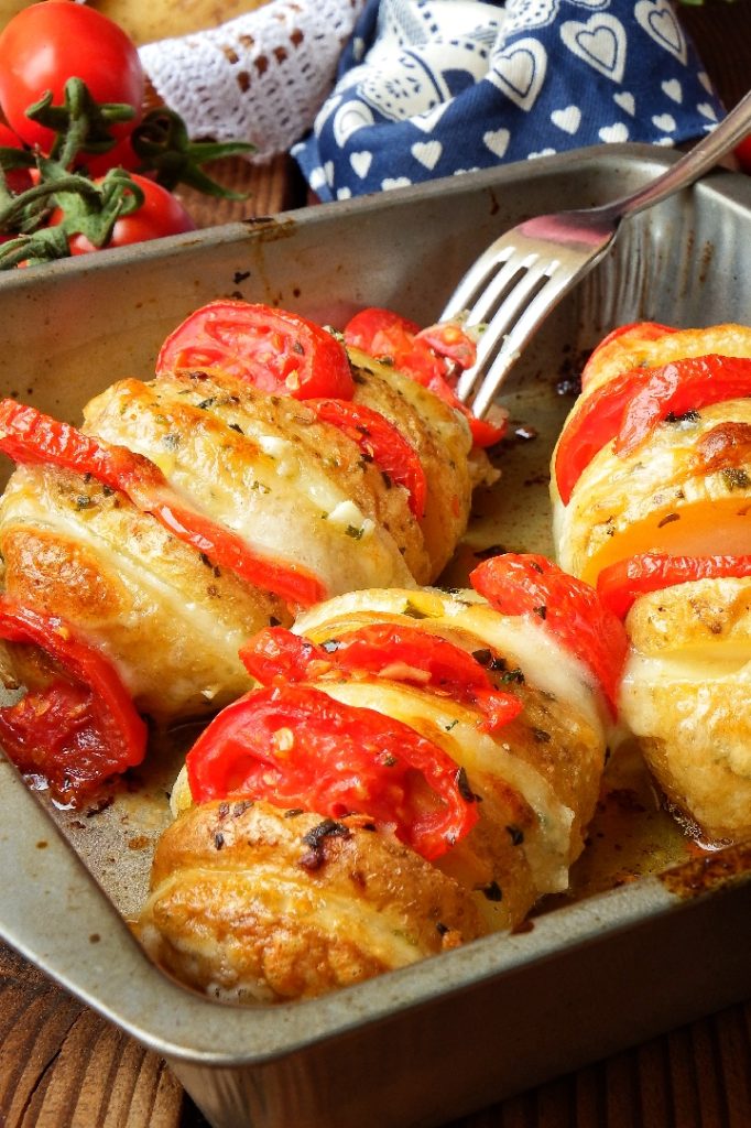 Les pommes de terre en éventail avec tomates cerises et mozzarella sont un plat principal sain et délicieux à servir à table. Une idée savoureuse préparée avec très peu d’ingrédients mais rendue originale en un rien de temps!