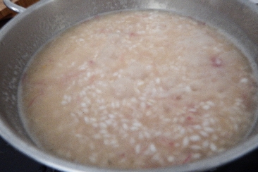 Mettez l’oignon finement haché dans la casserole. Ajoutez le riz et faites-le griller pendant deux minutes à feu vif en remuant fréquemment. La torréfaction du riz est une étape fondamentale pour la préparation d’un risotto réussi, en effet elle garde le grain compact qui libérera progressivement l’amidon pendant la cuisson le rendant ainsi crémeux. Déglacez avec le vin blanc et laissez évaporer.