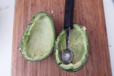 Couper les deux avocats en deux et récupérer la chair à l’aide de la cuillère parisienne, garder les 4 coques de côté.