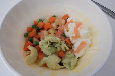 Dans le bol contenant les légumes, ajouter la mayonnaise, le saumon, l’avocat, la ciboulette émincée et rectifier avec du sel et du poivre. Mélanger soigneusement, couvrir le bol avec du film alimentaire et conserver au réfrigérateur pendant une heure. Verser la salade russe avec avocat et saumon dans les coques réservées et bon appétit!