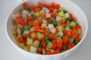 Cuire la pomme de terre avec la peau jusqu’à ce qu’elle soit tendre, égoutter et laisser refroidir, peler et couper en dés. Éplucher la carotte et cuire al dente pendant environ 10 minutes, laisser refroidir et couper en dés. Blanchir les petits pois pendant une minute.