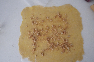Préparez maintenant la pâte pour le strudel : dans un bol, mélangez la farine avec le beurre en morceaux, sel, sucre, œuf et eau tiède