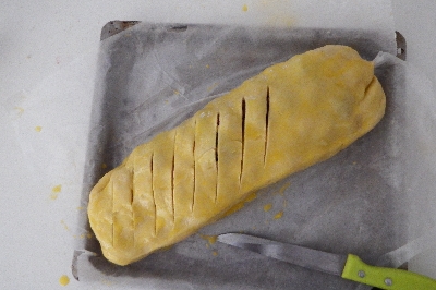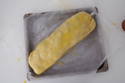 Mettez le strudel sur la plaque de cuisson recouverte de papier sulfurisé et badigeonnez avec l’œuf battu à part