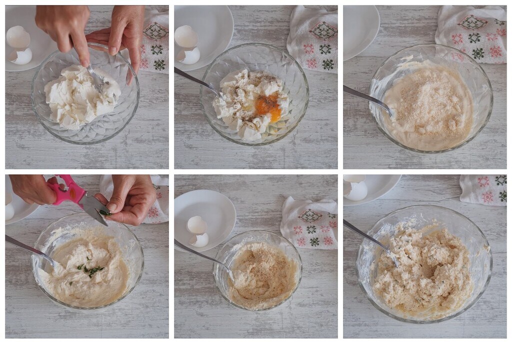 Enfin, incorporez la chapelure en 2 fois (environ 35 g mais la quantité peut varier, cela dépend de la sécheresse de la ricotta) jusqu’à obtenir une pâte suffisamment ferme pour former les boulettes.