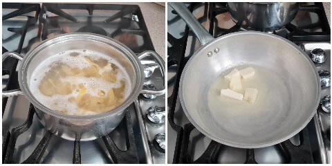 Pendant que les pâtes cuisent, faites fondre le beurre à feu très doux dans une grande poêle. Si nécessaire, soulevez légèrement la poêle du réchaud pour que le beurre fonde sans risquer de brûler.