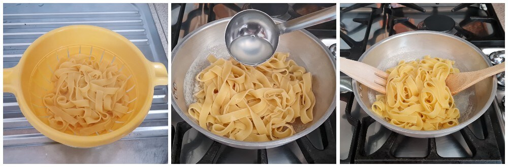 Lorsque les fettuccine sont cuites, égouttez-les en récupérant une partie de l’eau de cuisson. Versez-les dans la poêle avec le beurre et ajoutez une louche d’eau de cuisson des pâtes. Mélangez rapidement.