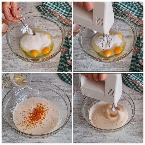 Placez dans un bol les œufs, le sucre et une pincée de sel; fouettez avec les fouets jusqu’à obtenir un mélange clair et mousseux.