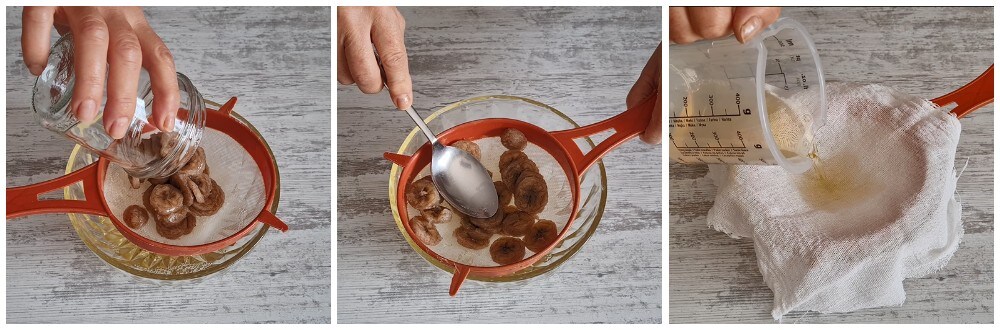Filtrez l’alcool aromatisé à la banane en le faisant tomber dans un bol, puis filtrez-le une deuxième fois en le faisant passer à travers le tamis doublé d’une gaze.