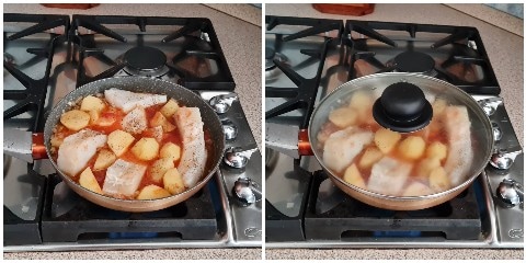 Lorsque l’oignon est bien doré, ajoutez les pommes de terre, environ 300 ml d’eau, la pulpe de tomate et une pincée de sel (n’en faites pas trop avec le sel car la morue est déjà assez salée). Mélangez le tout, couvrez et portez à ébullition.