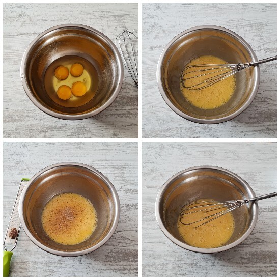 Placez les œufs dans un bol et battez-les quelques instants. Ajoutez une pincée de sel et quelques râpures de noix de muscade ; mélangez avec le fouet.