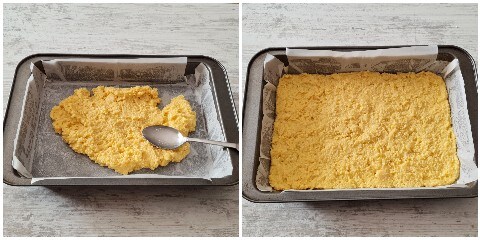 Versez le mélange dans un moule d’environ 30×20 cm beurré et tapissé de papier sulfurisé et nivelez-le avec le dos d’une cuillère.