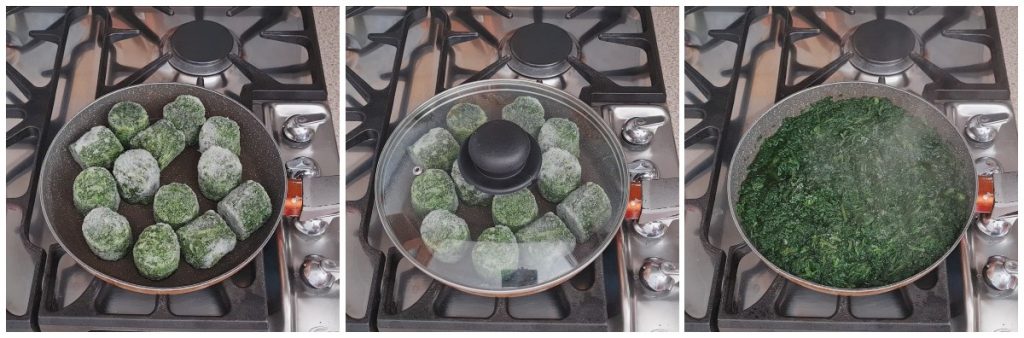 Mettez les épinards surgelés dans une poêle antiadhésive, couvrez et laissez cuire à feu doux en remuant de temps en temps jusqu’à ce qu’ils soient décongelés.