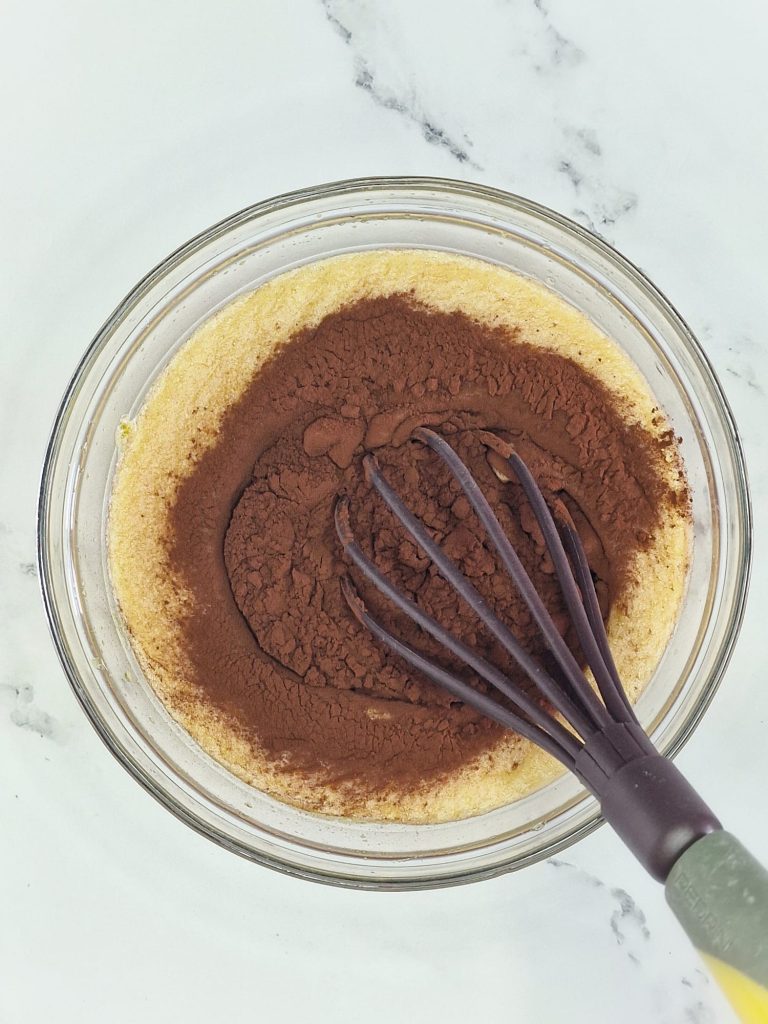 Ajoutez ensuite, dans l’ordre, le cacao en poudre tamisé et incorporez-le aux œufs avec un fouet à main, le chocolat fondu et incorporez-le à la pâte et, enfin, la farine et la vanilline tamisées.