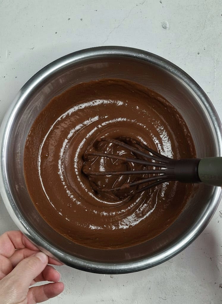 Transférez la crème pâtissière au chocolat dans un bol en acier refroidi (je le mets au congélateur pendant 15 minutes) et continuez à mélanger rapidement avec le fouet jusqu’à ce que la crème atteigne 50 °C, en dessous du point de cuisson.