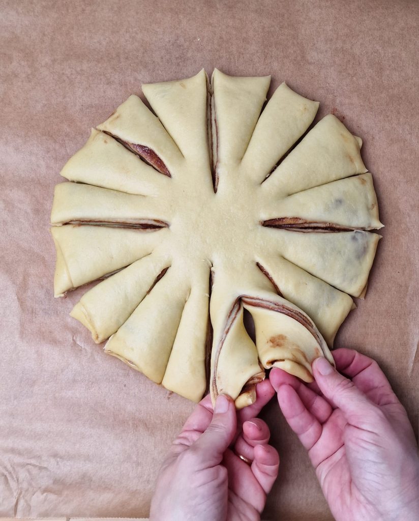 Prenez deux triangles de pâte à la fois, enroulez-les sur eux-mêmes vers l’extérieur et joignez les extrémités. Une fois terminé, aidez-vous du papier cuisson pour transférer l’étoile sur une plaque et laissez-la lever à nouveau pendant environ 1 heure.