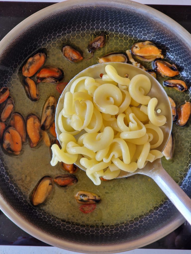 • Quand les pâtes sont cuites al dente, retirez-les avec une écumoire et transférez-les dans la poêle, ajoutez également la crème de pommes de terre et mélangez. Aidez-vous avec un peu d’eau des moules pour obtenir la bonne onctuosité.