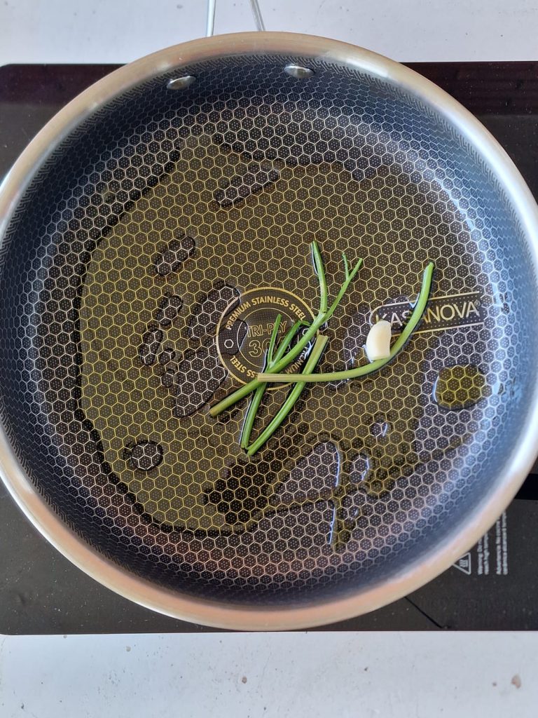 • Dans une poêle, faites revenir, dans un fond d’huile d’olive, une gousse d’ail et des tiges de persil frais. Quand l’ail commencera à crépiter, ajoutez aussi les moules dans la poêle et couvrez avec un couvercle.