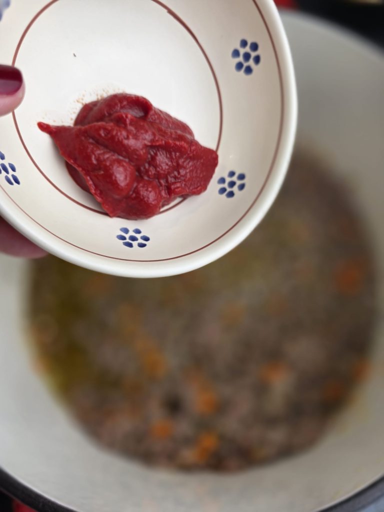• Laissez évaporer l’alcool puis ajoutez d’abord le concentré de tomate, puis la passata de tomates.
