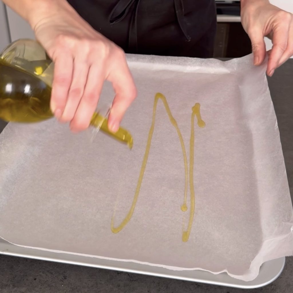 Tapissez une plaque de papier sulfurisé et versez de l’huile,