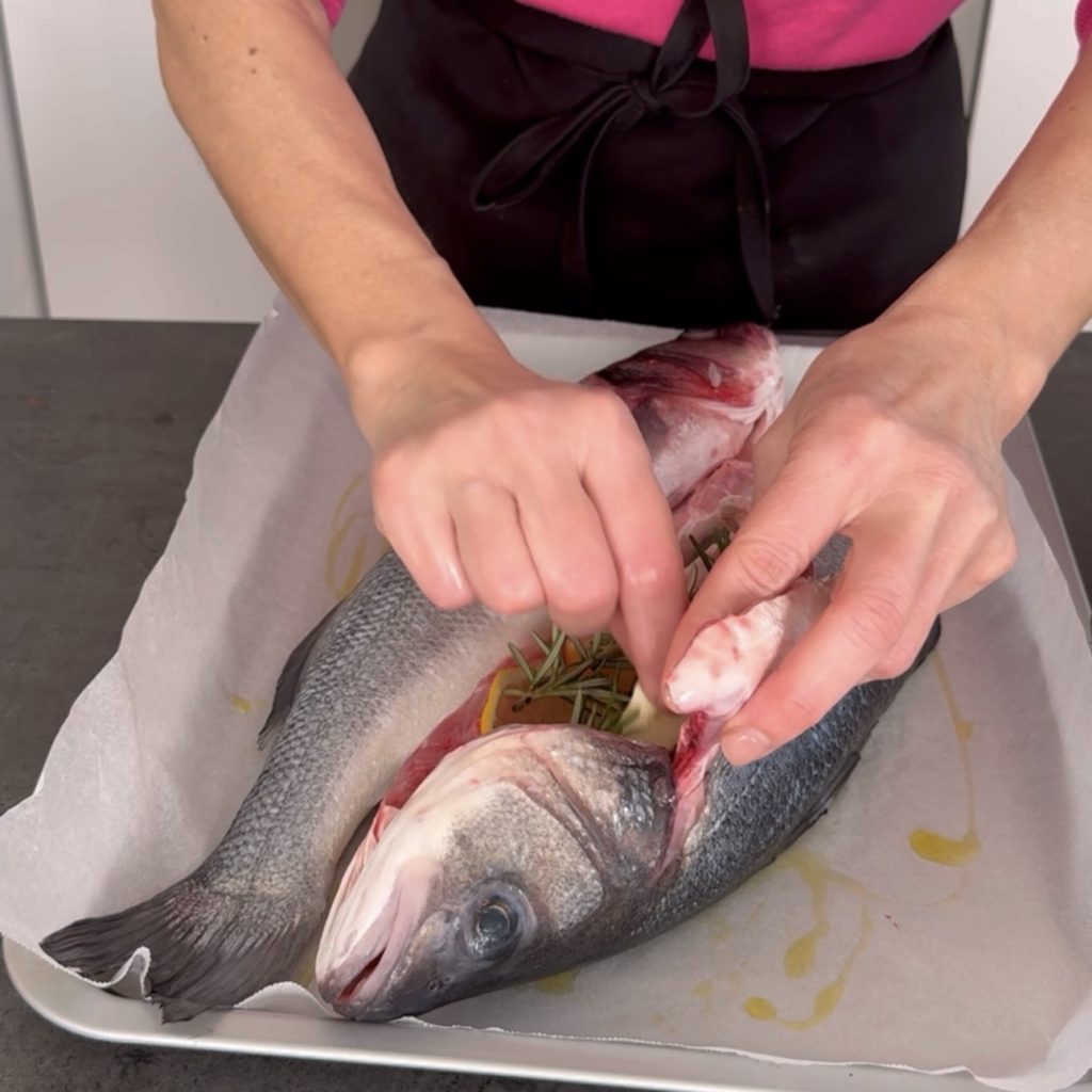 Quand les bars sont prêts, sortez-les du four, retirez les herbes internes et servez-les en filets