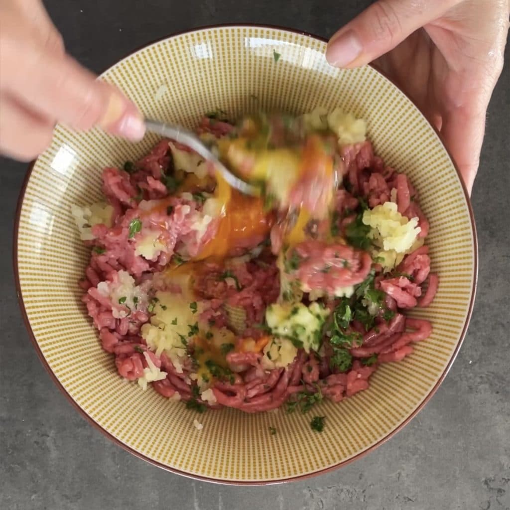 • Commençons à préparer les Boulettes à la bière, faites cuire une pomme de terre à l’eau ou à la vapeur, versez la viande hachée dans un saladier, ajoutez la pomme de terre cuite écrasée,