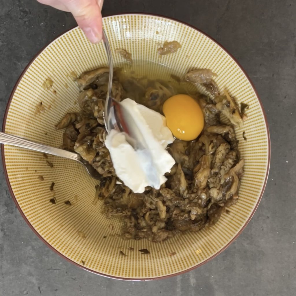 • Quand les aubergines seront cuites et la chair tendre, retirez-les du four et laissez-les refroidir, vous pouvez également cuisiner les aubergines la veille. Avec une cuillère, retirez la chair des aubergines,