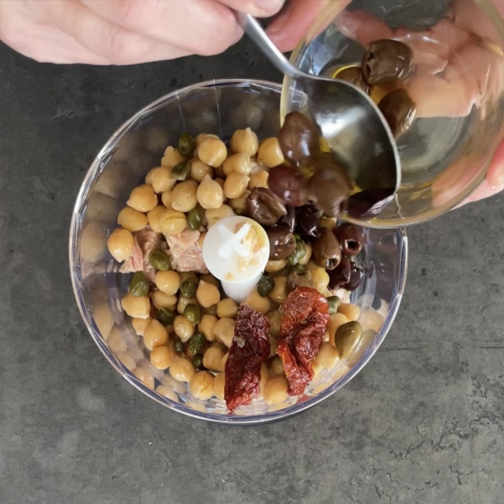• Nous allons commencer à préparer les boulettes de pois chiches et thon, versez dans le bol du mixeur les pois chiches, le thon,