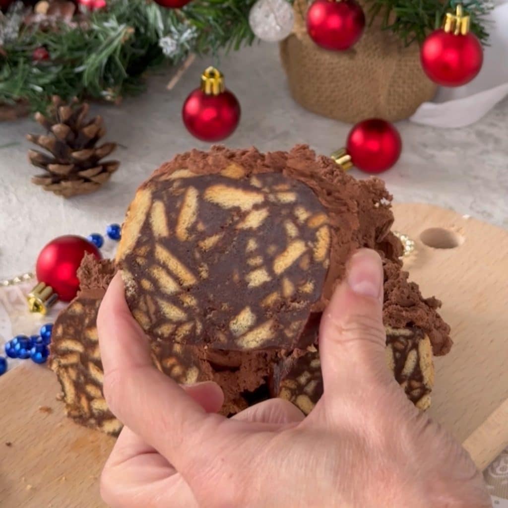 Bûche de Noël facile et rapide, un dessert parfait à servir pendant toutes les fêtes de Noël. Pour préparer la bûche de Noël au chocolat, vous pouvez même vous faire aider par vos enfants, c’est facile et ne nécessite pas de cuisson, la seule chose est de faire fondre le chocolat, mais on peut aussi le faire au micro-ondes comme je le fais toujours. Pour embellir et décorer cette Bûche de Noël astucieuse, j’ai ajouté des décorations en chocolat, mais vous pouvez également ajouter des décorations en pâte à sucre, des bonbons ou d’autres décorations que l’on trouve facilement dans les supermarchés ou dans les magasins spécialisés, en gros, vous pouvez vous amuser comme vous le souhaitez ou la laisser simple. Maintenant, voyons comment faire la bûche de Noël au chocolat et si vous essayez, faites-le moi savoir. Barbara