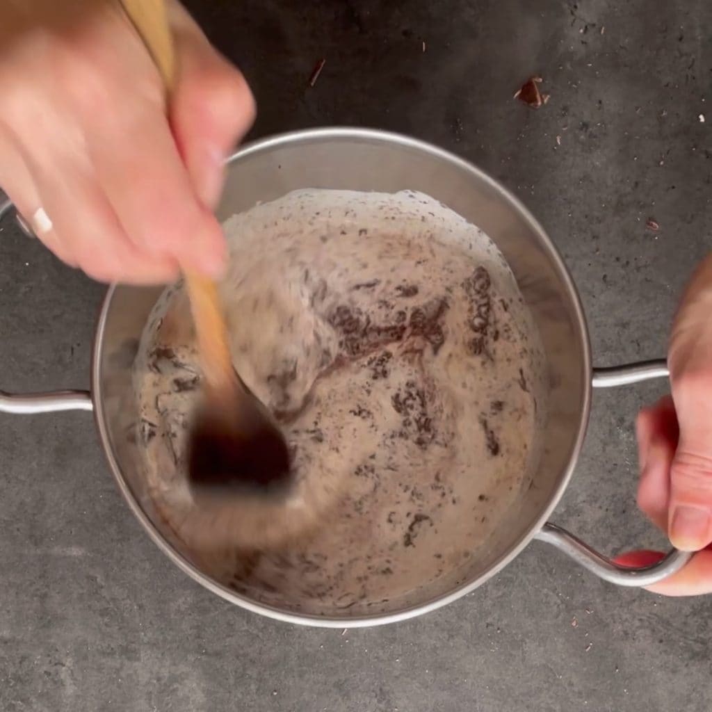 et le lait, faites fondre au micro-ondes pendant 2 minutes à 600 W, si vous n’avez pas de micro-ondes, faites d’abord chauffer le lait puis, lorsqu’il sera chaud, ajoutez le beurre et le chocolat en morceaux et mélangez jusqu’à ce qu’ils soient complètement fondus.
